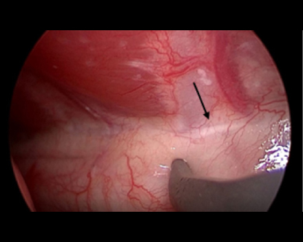 胸腔鏡で覗くと胸管がキレイに見えます(黒矢印)。