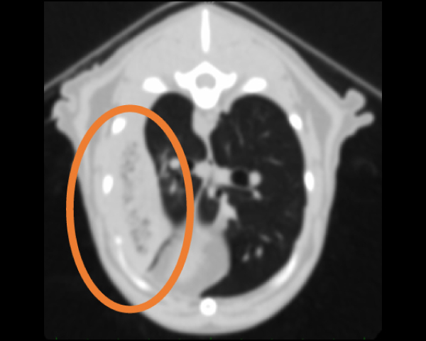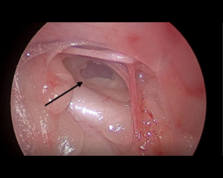 胸腔鏡で覗くと胸管がキレイに見えます(黒矢印)。