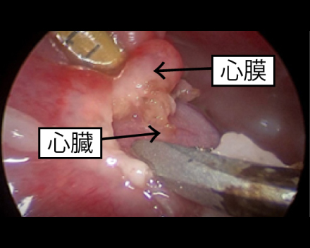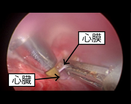 心膜の一部を吊り上げて心膜と心臓の間にスペースを作ります